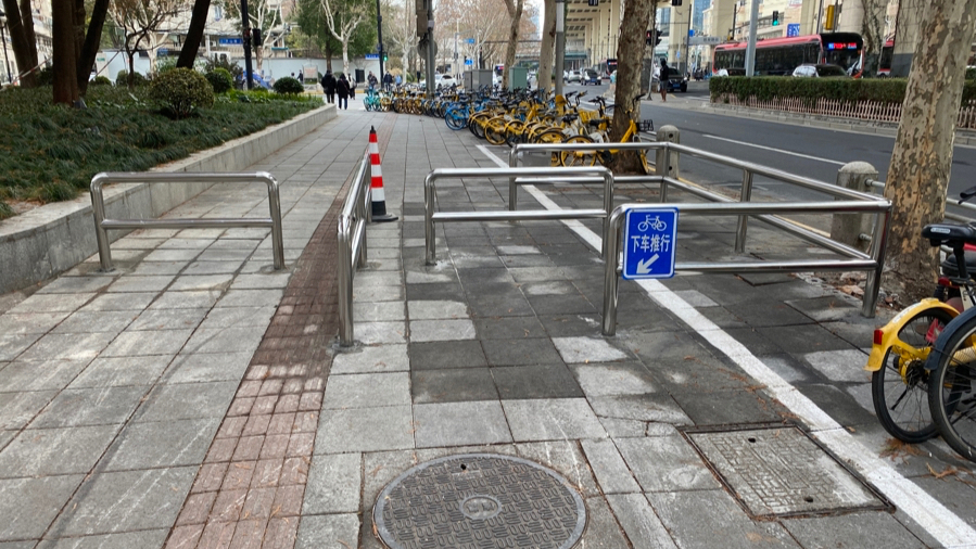 然而,市民对栏杆设置的合理性提出质疑。“这些栏杆根本拦不住非机动车,反而对正常通行造成了影响。”记者现场看到,栏杆设立后,依然有不少外卖骑手骑着电动车从“凹”字形栏杆穿过,只是速度放缓,也没有下车推行,还有市民骑着共享单车从栏杆空隙中穿过,并不受影响。反而是一些行动不便的老人,在步行通过栏杆时颤颤巍巍,需要时时注意以免发生磕碰。遇到推着轮椅或婴儿车出行的市民,到达此处时通行更加费劲,要从“凹”字形栏杆中转几个弯才能通过。