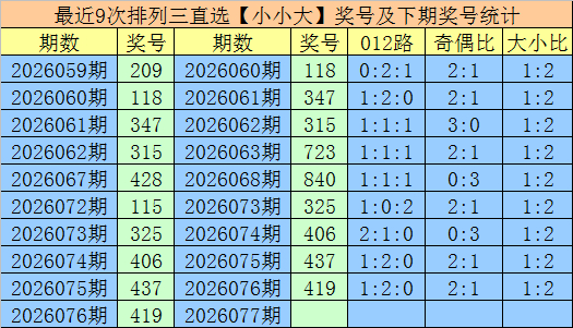 上期总结:摆设三第2026076期奖号为419,组六,大小比开出1:2,直选漫衍为:小小大。