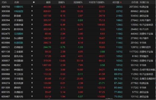 阛阓收获效应较好,系数4293只个股收涨,涨停股88只;1072只个股收跌,跌停股9只。14只个股日成交额超100亿元,CPO意见龙头股“易中天”(中际旭创、新易盛、天孚通讯)集体大涨,半导体个股兆易鼎新、寒武纪相同发扬亮眼。