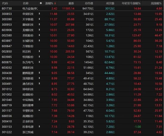 电力开拓也发扬可以,8只个股涨停,包括龙蟠科技、圣阳股份、长城科技、万里股份、科达利等。