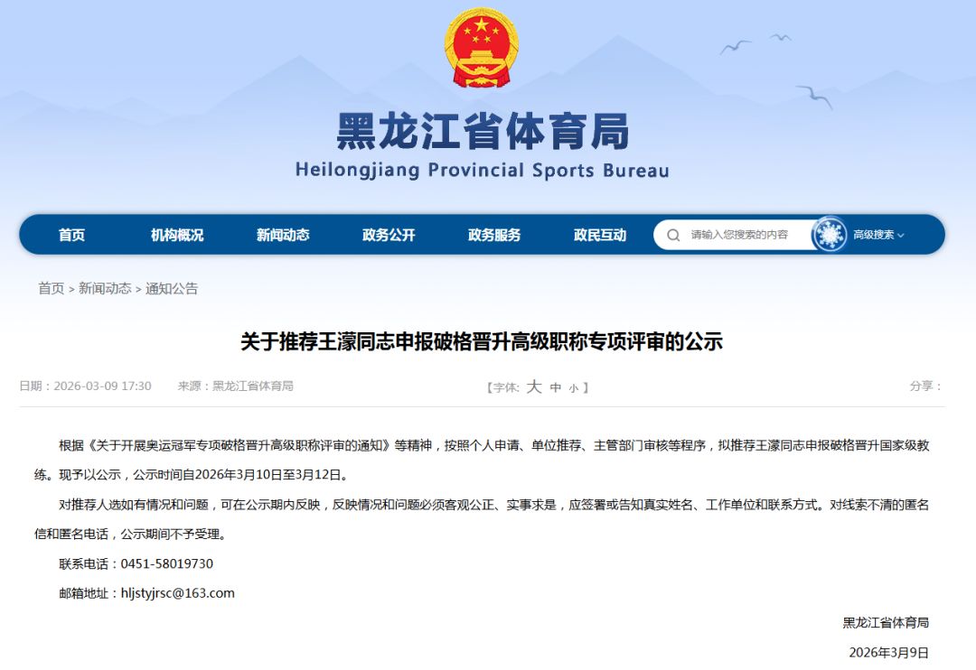字据《对于开展奥运冠军专项破格普及高等职称评审的见告》等精神,按照个东说念主肯求、单元保举、操纵部门审核等行为,拟保举王濛同道陈述破格普及国度级培植。现赐与公示,公示时辰自2026年3月10日至3月12日。