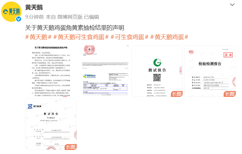 今天(3月25日)15时许,黄天鹅发布“对于黄天鹅鸡蛋角黄素抽检成果的声明”: