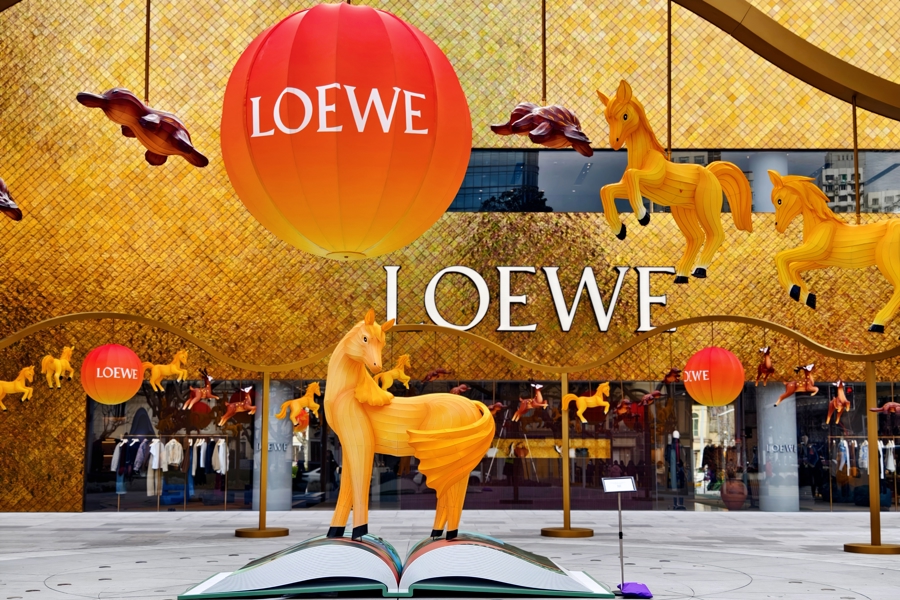 在静安嘉里中心广场前,一匹暖黄色小马从展开的书本中跃然而出,不少市民游客纷纷点赞。这是由LOEWE罗意威与上海美术电影制片厂联合打造的“盏盏新年”艺术场景,以山水为幕、灯笼为缀,尽显“中国美学”。