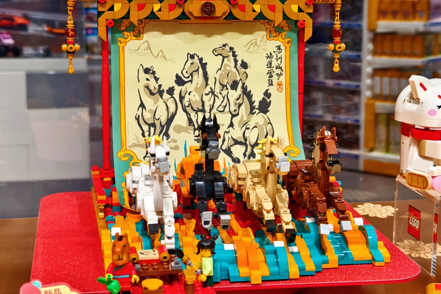 位于世茂广场的乐高品牌旗舰店,将马年新春特色主题积木新品“骏马鸿图”摆放在进门最醒目的位置,它将中国传统美学与乐高积木颗粒创意融合,以骏马元素为核心意象,搭配用国画风格绘制的画布,诠释“马到成功,鸿运当头”的美好寓意。这款产品已于第八届进博会“玩乐之城”展台亮相,并于2025年12月底正式上市,定价999元。