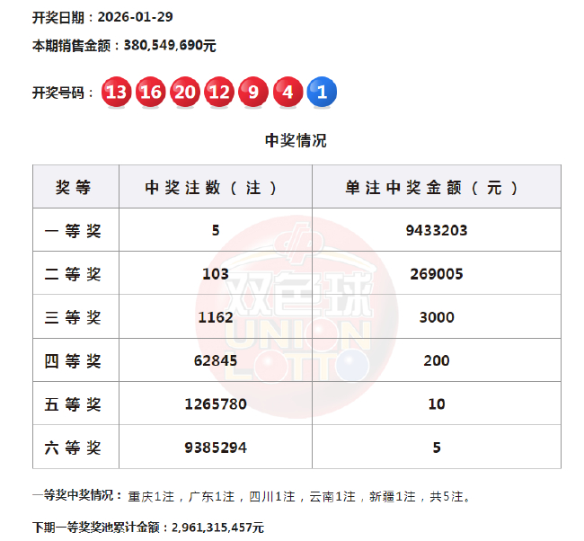 北京时间2026年1月29日,福彩双色球第26013期开奖,广州期货配资当期开奖号码为红球04 09 12 13 16 20,蓝球01。需要注意的是,根据福彩官方发布公告,双色球将于2026014期(2026年2月1日开奖)开始,变更游戏规则,新增福运奖,且一、二等奖增设封顶额!详情点击:中国福利彩票双色球游戏规则