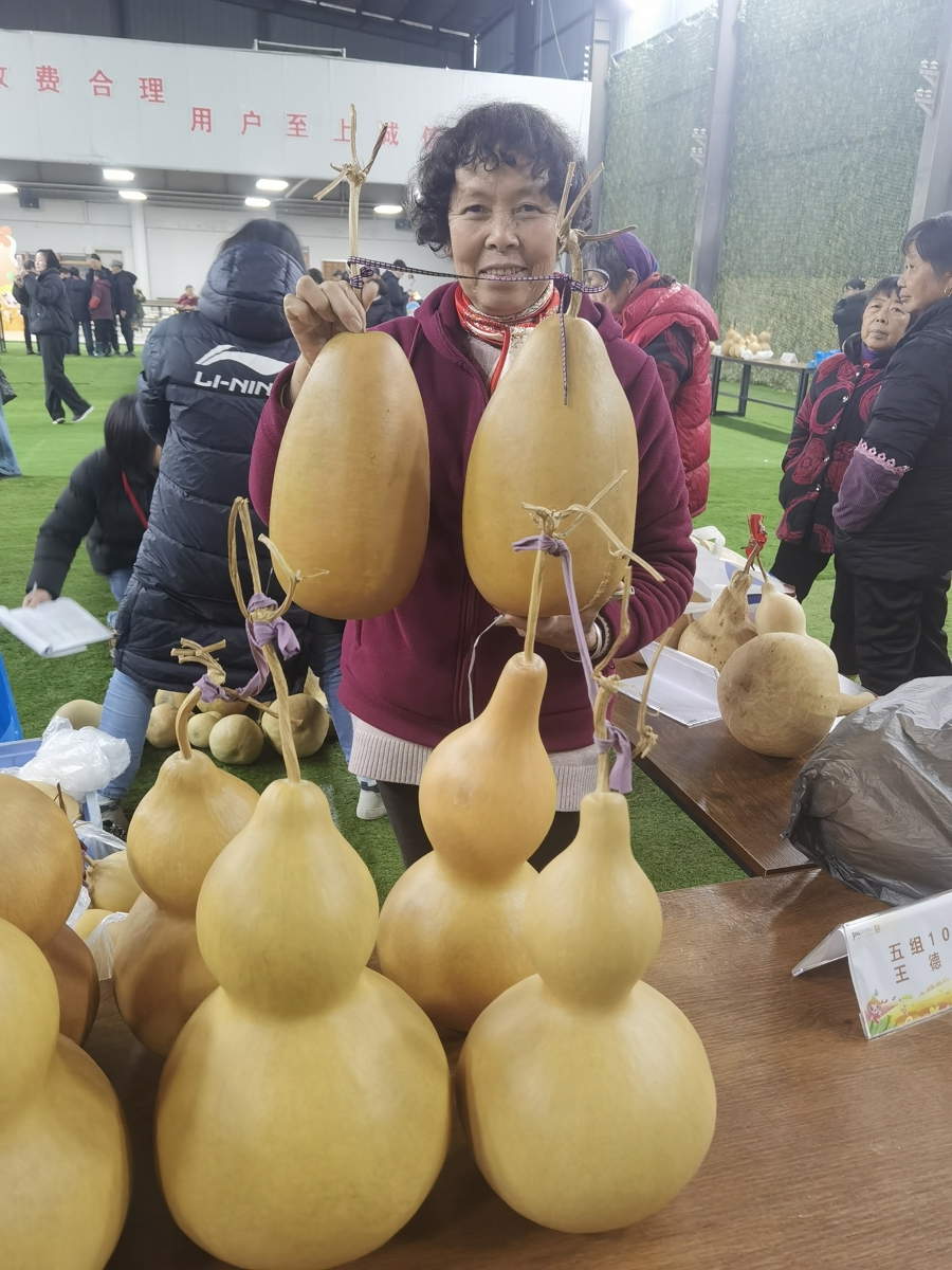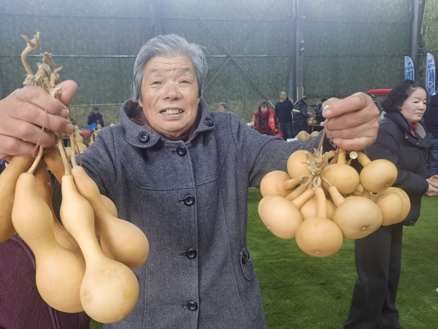 在当天的葫芦争霸赛中,张爱芳阿姨因种出的葫芦又大又好,连续第三次当选“葫芦王”,再次获得龙头企业的高价收购。小小“庭院经济”,让农村老人在家门口轻松获得1万多元增收。