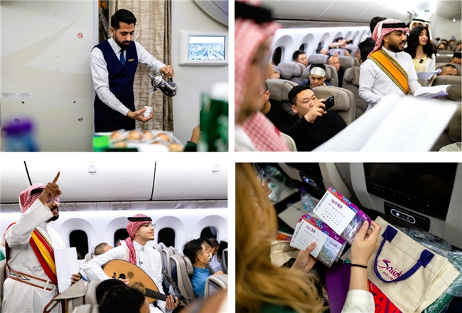 航班自北京起飞起,便沉浸于浓郁的阿拉伯文化氛围与热情周到的服务之中。登机时的特色欢迎仪式拉开了“空中奇遇”的序幕。飞行途中,客舱内文化互动精彩不断:乌德琴现场演奏悠扬旋律,身着传统服饰的沙特表演者带来欢乐合唱与互动,生动展现了沙特人民的热情与活力。