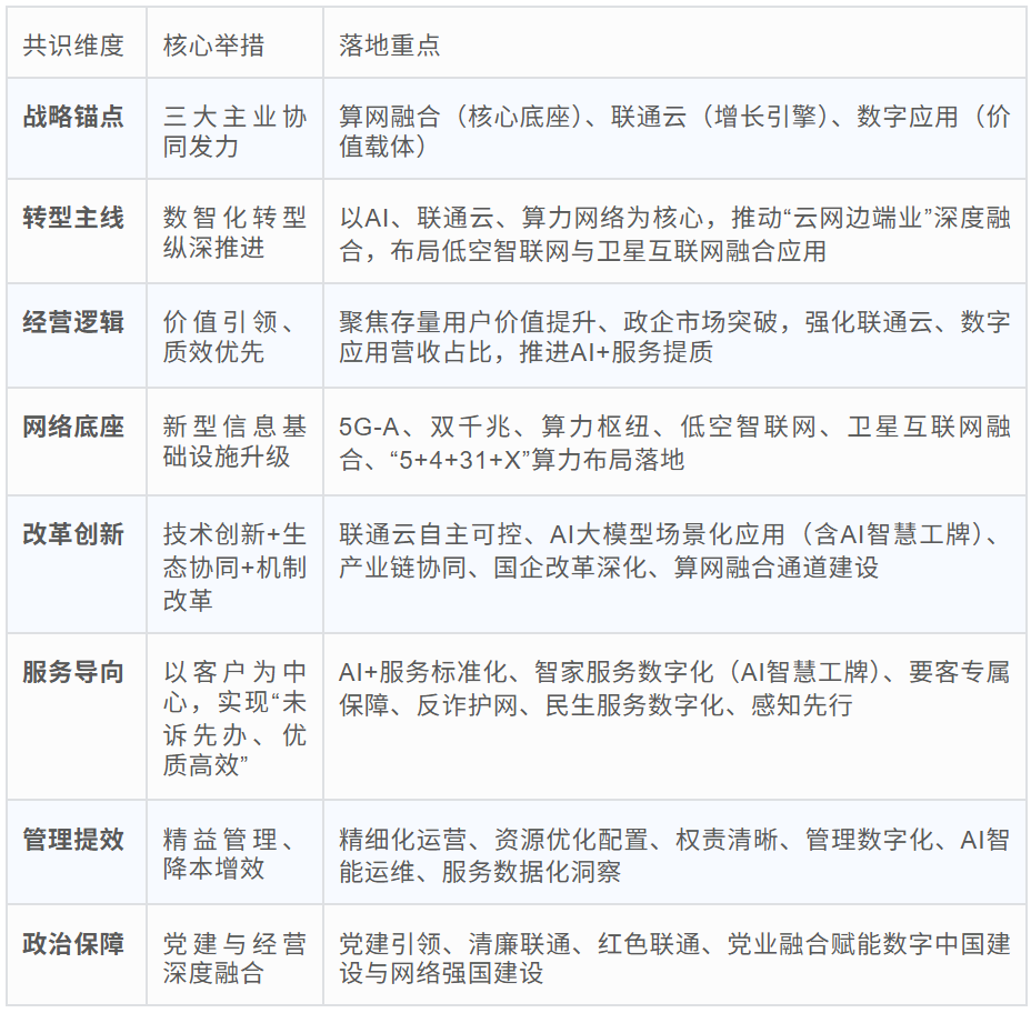 2.价值引颈成为中枢导向:各省均遗弃单纯用户规模扩展,转向存量价值挖掘、政企阛阓打破,重点强化联通云、数字期骗、AI行状的营收孝顺,与行业数智化转型趋势高度契合,同步推动AI+行状范例化,竣事“未诉先办、优质高效”。