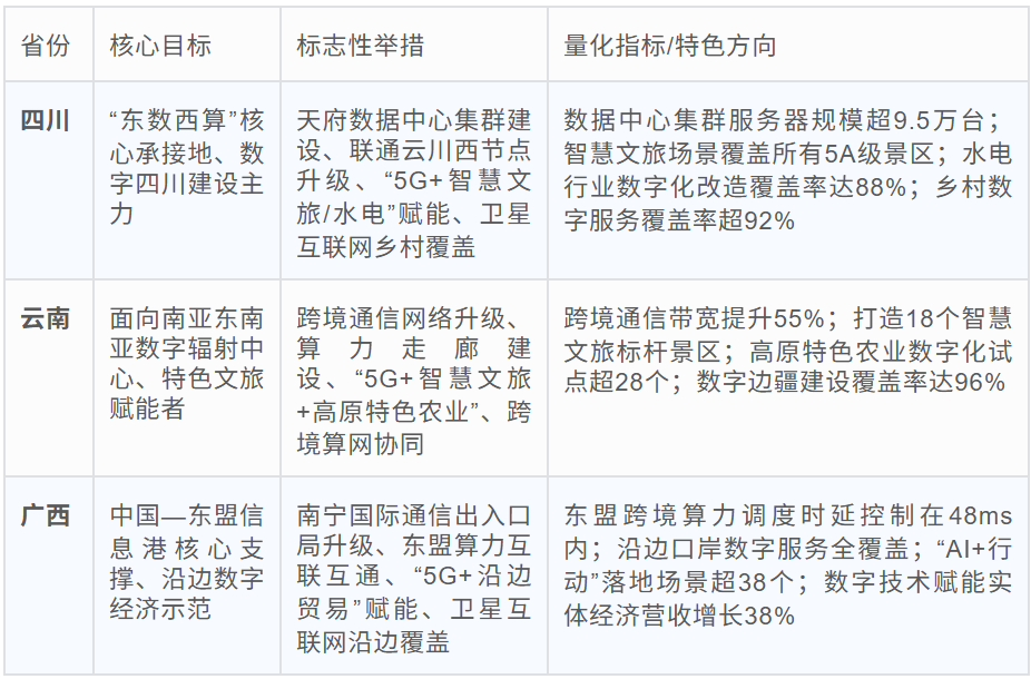 ○西部省份:聚焦跨境通讯、特质资源(文旅、水电、农业)、卫星互联网蔓延,如四川“东数西算”、云南跨境算力走廊、广西中国—东盟信息港成就,强化乡村与沿边数字行状。