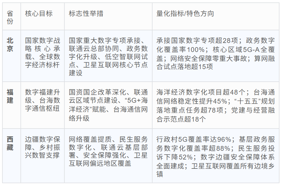 ○北京:国度要紧数字专项、王人门数字功能、卫星互联网中枢节点;福建:数字福建、台海通讯关节;广西:中国—东盟信息港;湖北:低空经济示范、中部数字支点。