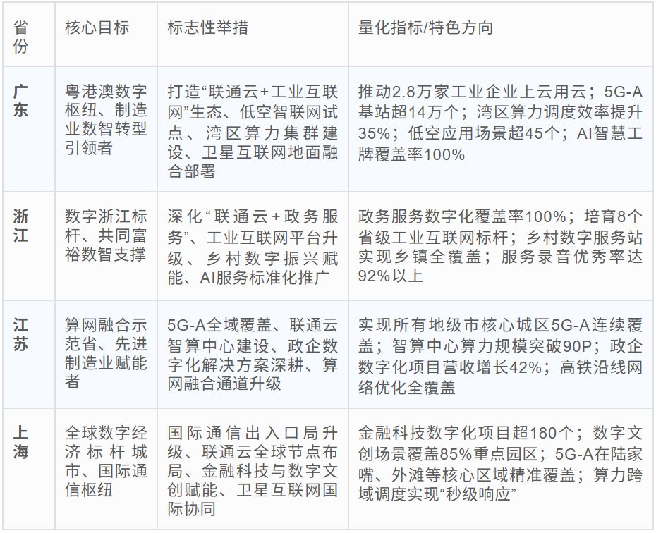 ○推崇省份:区域算力集群、联通云智算中心规模化运营、算网融和会谈升级(如广东湾区、上海全球节点),侧重算力高效谐和与AI、卫星互联网贯通期骗。