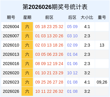 上期大乐透的开奖号码中,大小比为4:1,三区比为0:1:4,无重号。